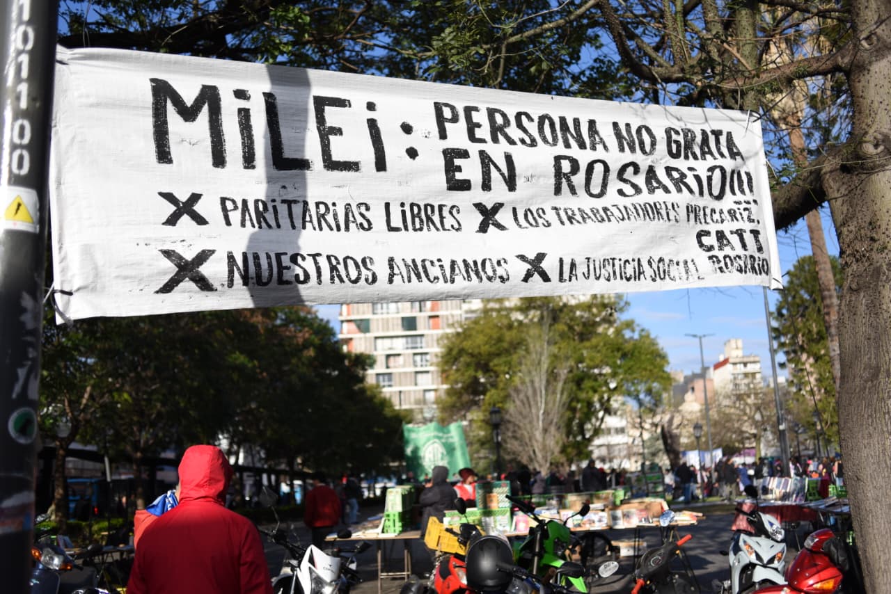En paralelo, gremios, organizaciones sociales y políticas se movilizaron desde San Juan y Corrientes hacia las adyacencias de la sede de la Bolsa, declarando a Milei “persona no grata” en Rosario. Los manifestantes expresaron su rechazo a las medidas de ajuste del gobierno nacional, que –advirtieron– golpean a jubilados, trabajadores y personas con discapacidad.