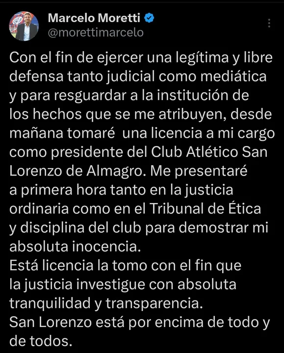 Así lo anunció el propio Moretti este martes por la noche en redes sociales, en un comunicado en el que dijo alejarse del “Ciclón” para que “la justicia investigue con absoluta tranquilidad y transparencia”.