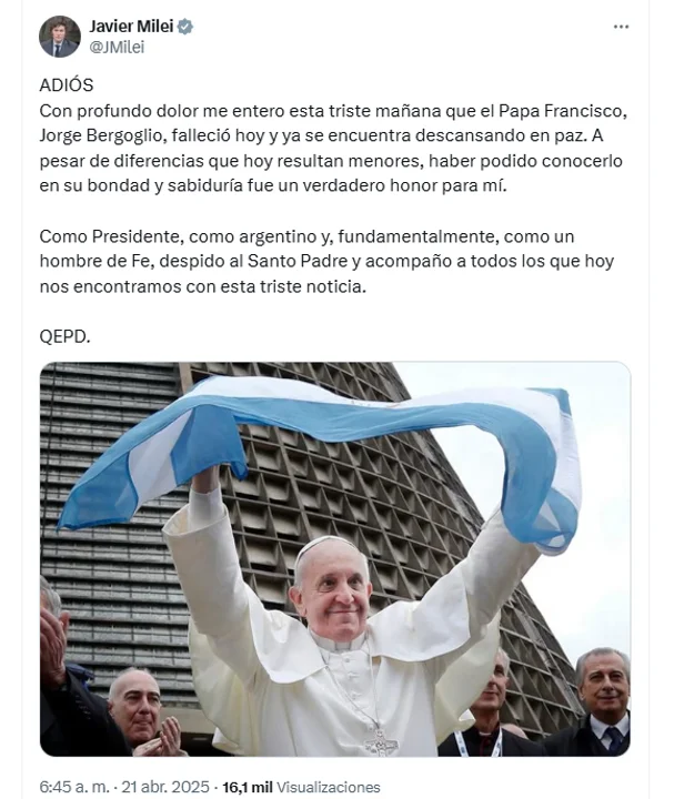 “ADIÓS. Con profundo dolor me entero esta triste mañana que el Papa Francisco, Jorge Bergoglio, falleció hoy y ya se encuentra descansando en paz. A pesar de diferencias que hoy resultan menores, haber podido conocerlo en su bondad y sabiduría fue un verdadero honor para mí. Como Presidente, como argentino y, fundamentalmente, como un hombre de Fe, despido al Santo Padre y acompaño a todos los que hoy nos encontramos con esta triste noticia. QEPD.”
