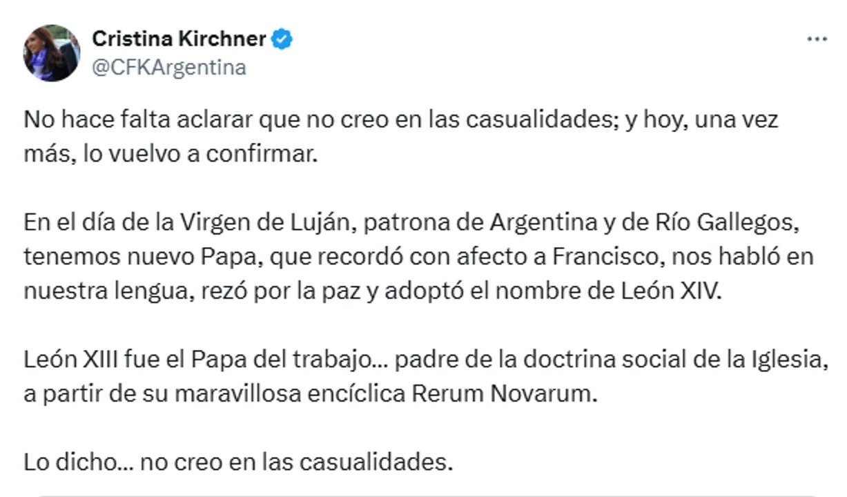 La ex presidenta destacó que León XIV habló en español, rezó por la paz y evocó a Francisco: “No creo en las casualidades”, escribió en sus redes