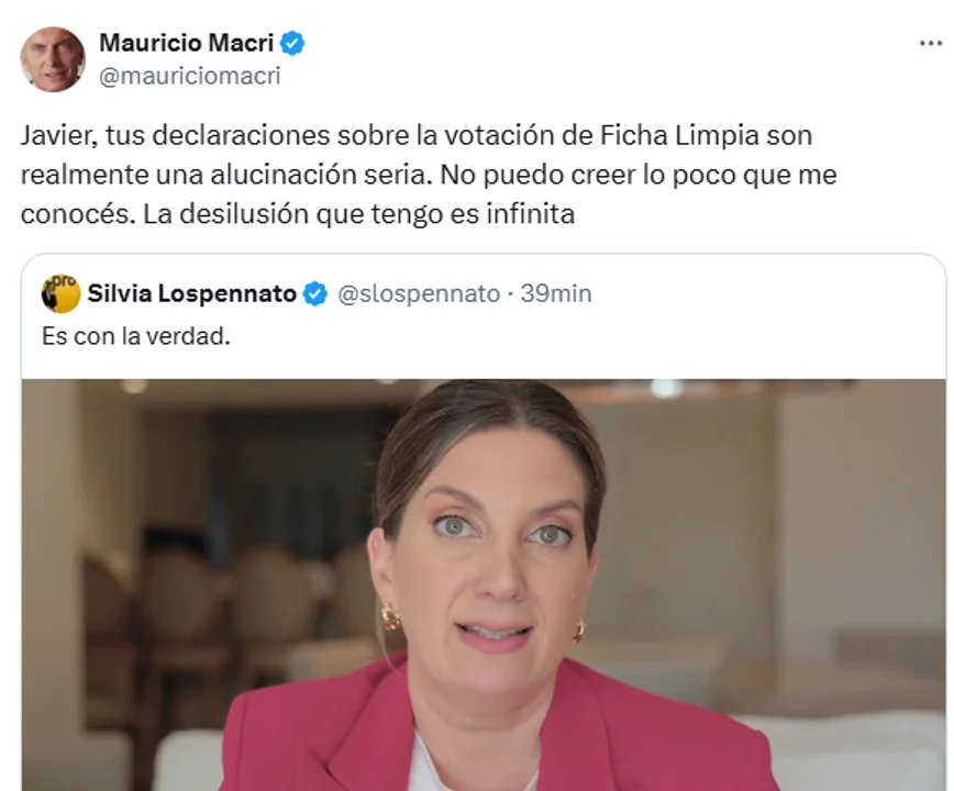 «Javier, tus declaraciones sobre la votación de Ficha Limpia son realmente una alucinación seria. No puedo creer lo poco que me conocés. La desilusión que tengo es infinita», escribió Macri en su cuenta oficial, con una mención directa al jefe de Estado.