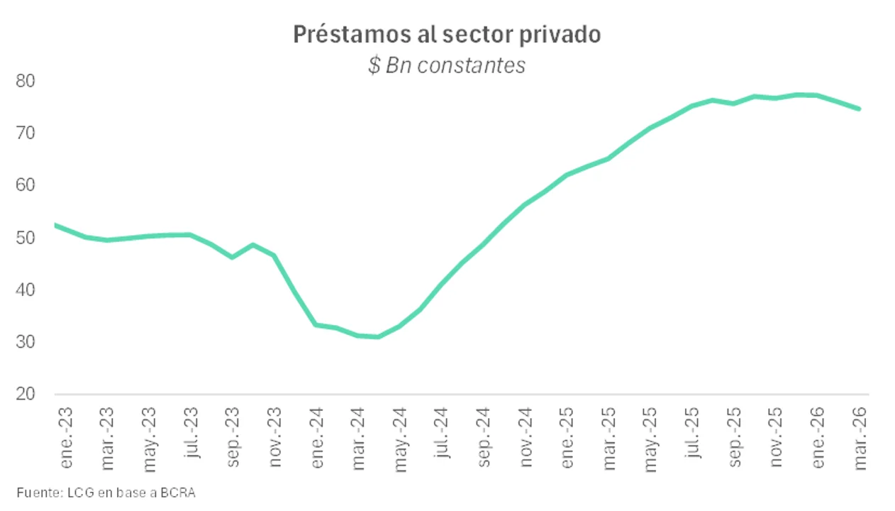 “Los préstamos en pesos cayeron por tercer mes consecutivo (-1,7% m/m en marzo) y volvieron a niveles reales de jun-25”, señaló un informe de la consultora LCG.