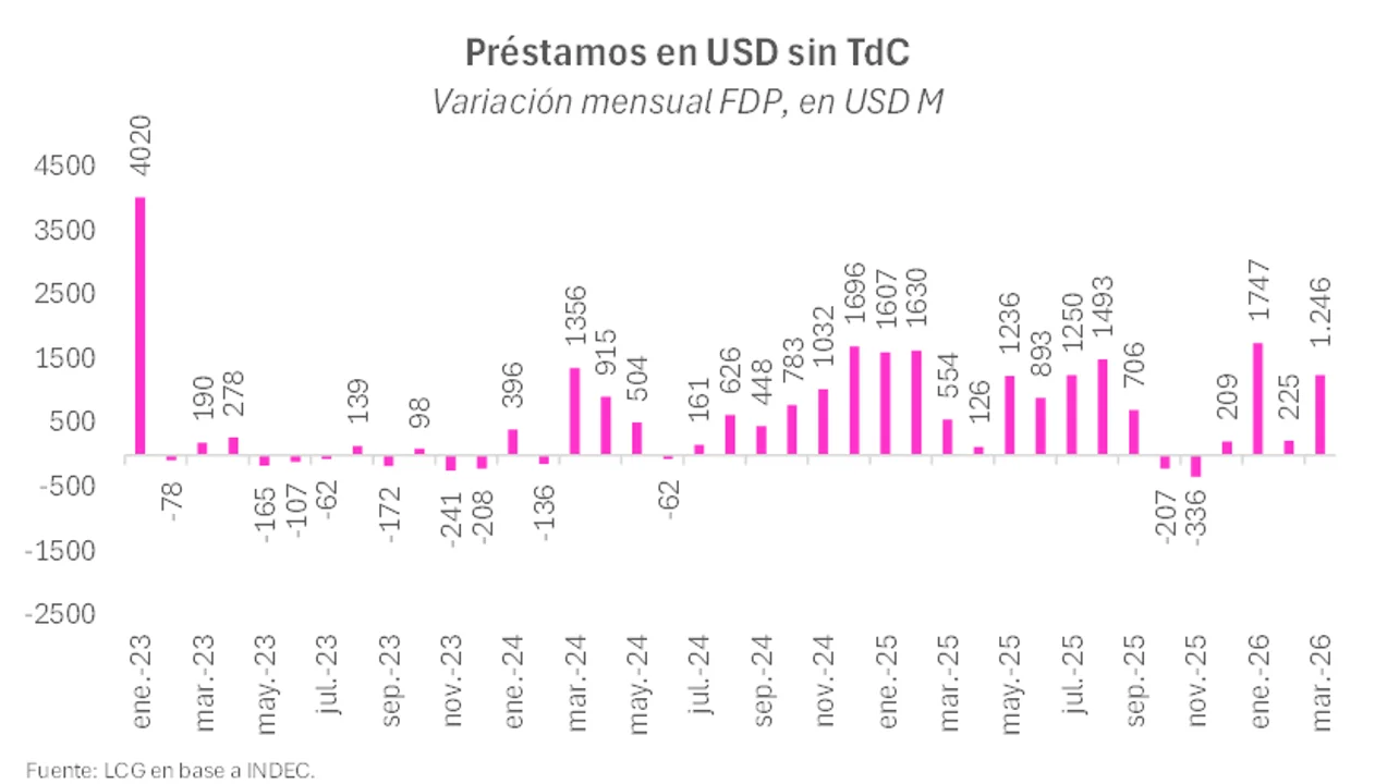 En cambio, “los préstamos en dólares (sin contar tarjeta de crédito), volvieron a crecer fuerte en marzo (+ US$ 1.246 M), luego de un febrero más bien mediocre”.
