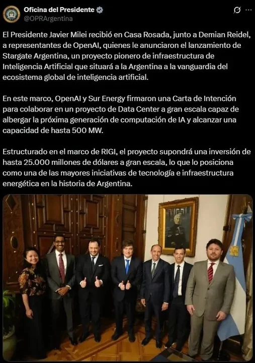 Mientras que OpenAI se mostró cauto y solo habló de un acuerdo para «explorar» el proyecto, la Oficina del Presidente Javier Milei fue mucho más allá. En un posteo en la red social X, el Gobierno aseguró que el proyecto, enmarcado en el Régimen de Incentivo para Grandes Inversiones (RIGI), «supondrá una inversión de hasta 25.000 millones de dólares a gran escala».