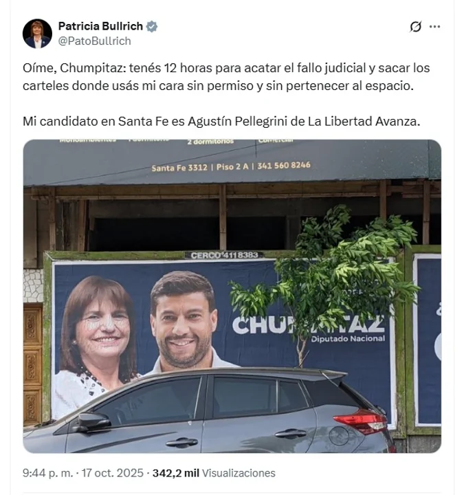 Según confirmó la propia ministra en su cuenta personal de X, la Justicia falló a favor de la demanda del partido libertario. “Oíme, Chumpitaz: tenés 12 horas para acatar el fallo judicial y sacar los carteles donde usás mi cara sin permiso y sin pertenecer al espacio”, instó la funcionaria en su publicación. De la misma manera, la candidata a senadora nacional por la Ciudad de Buenos Aires aclaró: “Mi candidato en Santa Fe es Agustín Pellegrini de La Libertad Avanza”.
