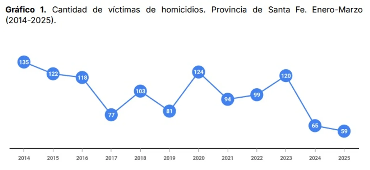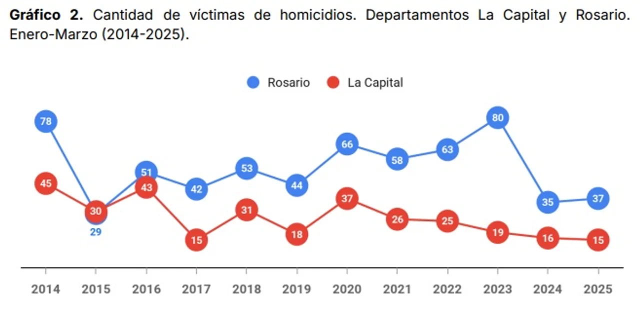 Aunque las cifras están muy por debajo de años críticos como 2014 (135 crímenes) o 2020 (124), el estudio también indica que en Rosario aumentó la proporción de homicidios en la vía pública: un 21,7% más que en el mismo período de 2024.