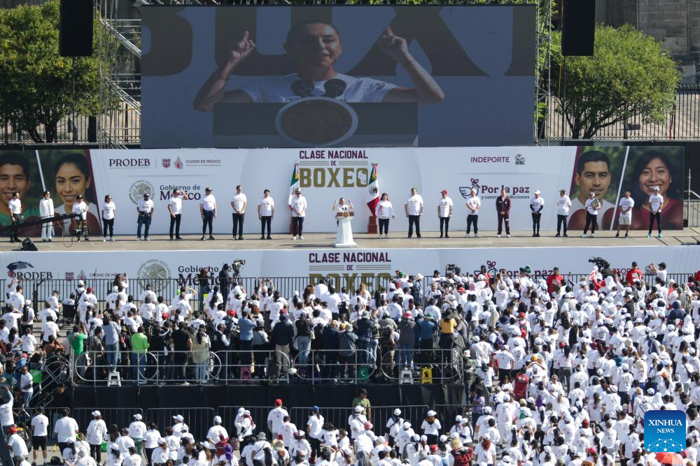 La presidenta de México, Claudia Sheinbaum, encabezó hoy domingo, junto a varias leyendas del deporte, el arranque de una clase masiva de boxeo en la plaza central de la Ciudad de México, actividad que se llevó a cabo de manera simultánea en las principales plazas del país.