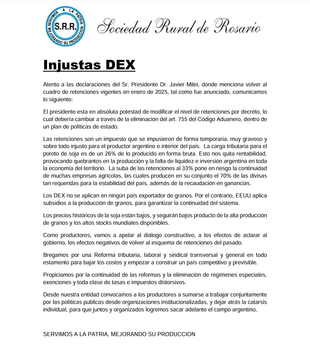 “Servimos a la patria, mejorando su producción”, concluye el texto firmado por la Sociedad Rural de Rosario.