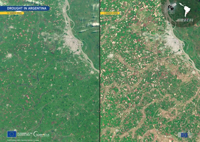 Para ilustrar el fenómeno, Copernicus difundió una comparación entre dos imágenes tomadas por el satélite Sentinel-2 con casi un año de diferencia. Una corresponde al 11 de marzo de 2025 y la otra al 1° de marzo de 2026. En el contraste se observa con claridad el cambio en el paisaje: el verde intenso que predominaba el año pasado dio paso a tonos marrones y amarillentos, señal de vegetación debilitada y suelos secos.