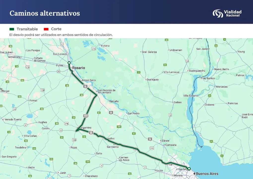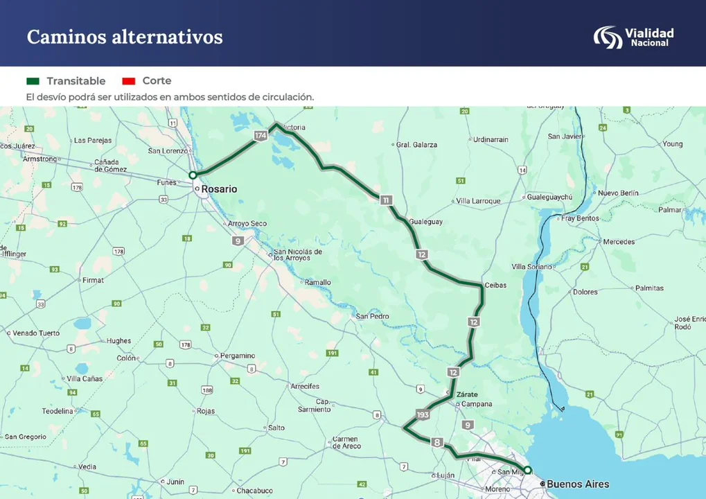 La Dirección Nacional de Vialidad agregó que ambos caminos pueden ser utilizados en ambos sentidos de circulación. Al tener en cuenta las instrucciones, los automovilistas pueden manejar desde la Ciudad de Buenos Aires hasta Rosario, o cualquiera de los puntos intermedios, utilizando ambas alternativas.