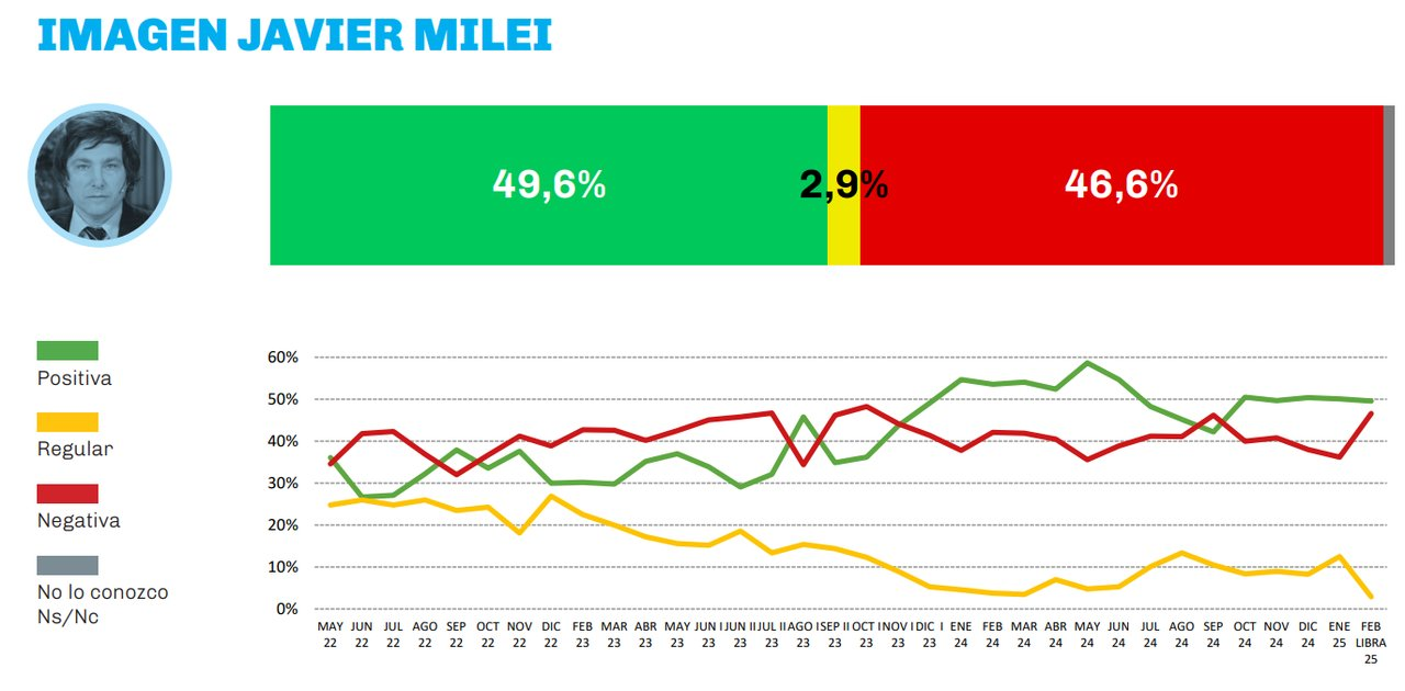 El informe difundido por la consultora Giacobbe arrojó que la imagen positiva de Milei se mantuvo en 49,6%, sosteniendo el nivel desde octubre del año pasado.