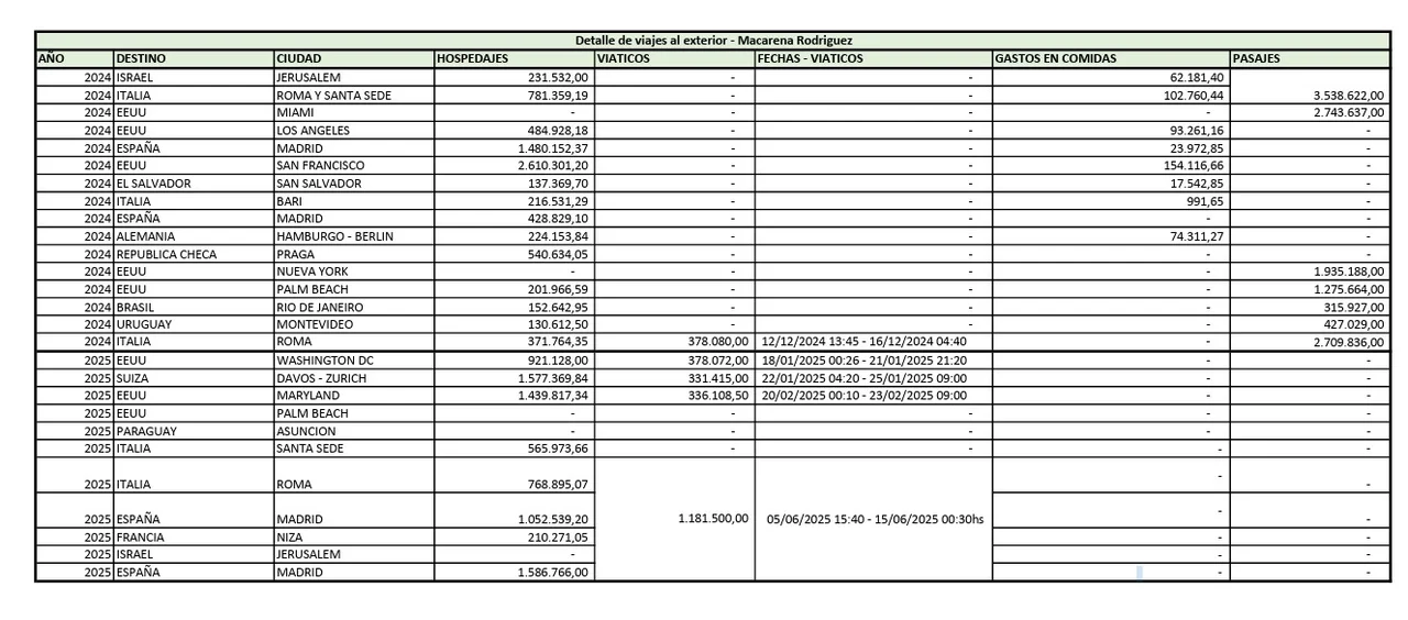 En total, más de 25 millones de pesos en boletos aéreos, hoteles y viáticos. Y eso sin contar los viajes que aún figuran “sin datos de gastos”, como Palm Beach y Jerusalén. El número real, por lo tanto, podría ser aún mayor.