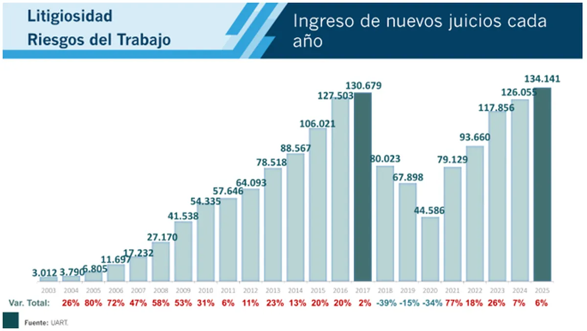Según estadísticas de la Unión de Aseguradoras de Riesgo de Trabajo (UART), durante el último cuatrimestre de 2025 la cantidad de nuevos juicios en Argentina fue un 12% superior al mismo período de 2024. En total, a lo largo del año pasado ingresaron 134.000 demandas por accidentes y enfermedades laborales, lo que representa un nuevo récord histórico y supera el máximo anterior de 2017, cuando se habían contabilizado 130.679 causas.