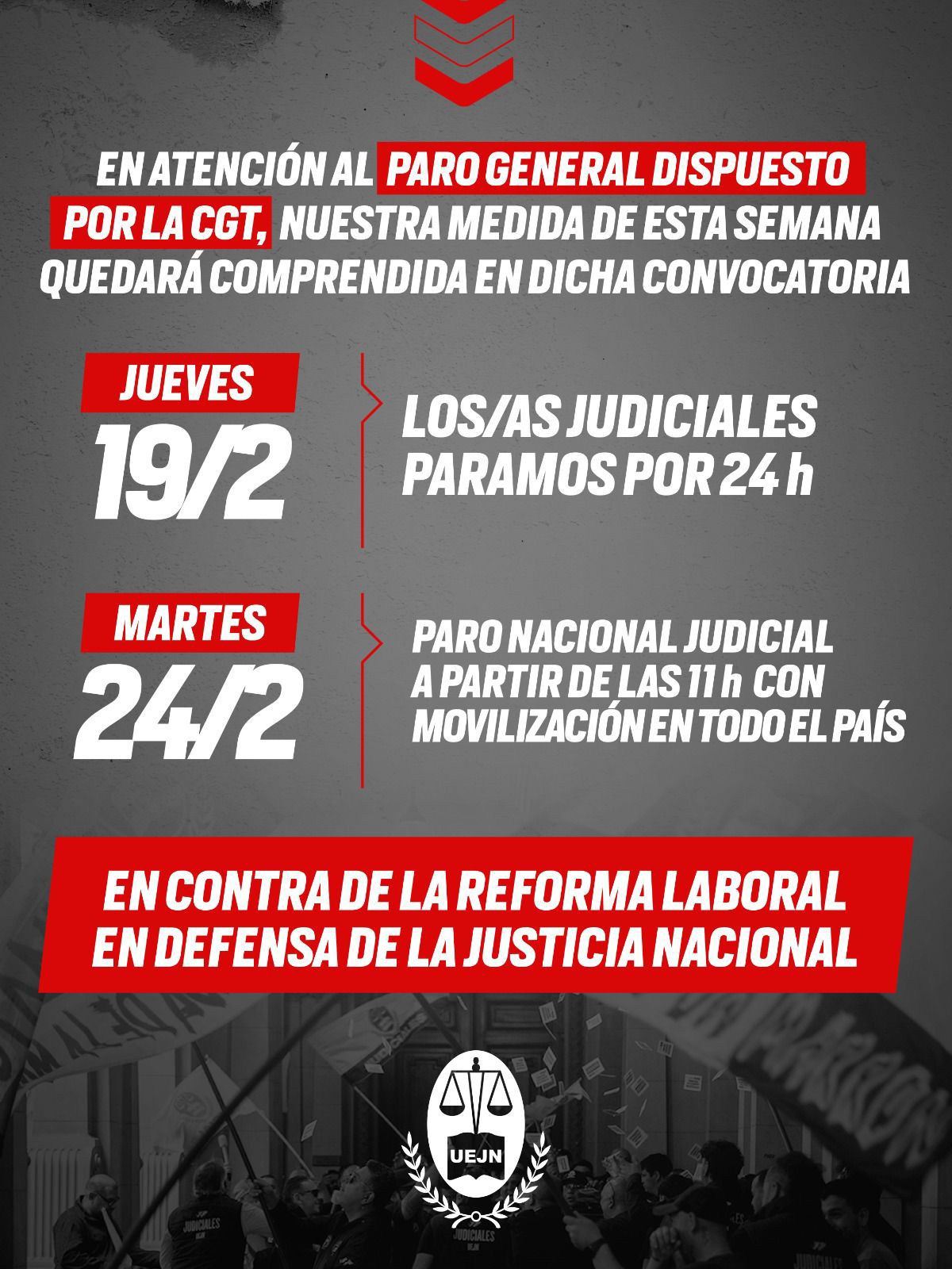 La medida de fuerza de la UEJN es en todo el país y habrá movilizaciones. La protesta es contra la reforma laboral que promueve el gobierno de Javier Milei y que ya tiene aprobación en ambas cámaras del Congreso.