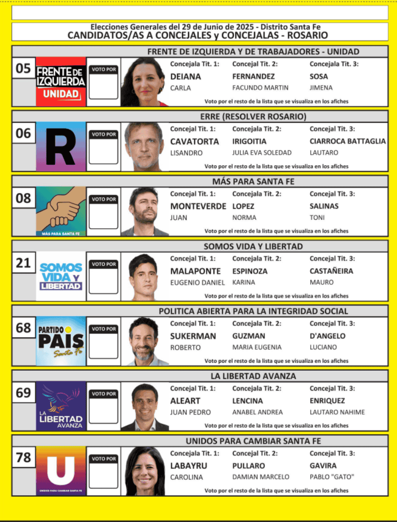 Entre las siete listas en competencia hay cuatro encabezadas por postulantes sin paso previo por el Palacio Vasallo: Carla Deiana (FIT), Eugenio Malaponte (Somos Vida y Libertad), Juan Pedro Aleart (La Libertad Avanza) y Carolina Labayru (Unidos). También figura un ex concejal que quiere volver: Roberto Sukerman, que lidera la nómina de PAIS.