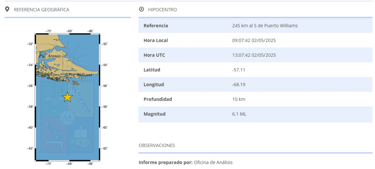 Según supo Noticias Argentinas, el fenómeno se produjo a las 09:07 a unos 225 kilómetros al sur de Puerto Williams, a una profundidad de 10 kilómetros, en cercanías del cabo de Hornos. El Centro Sismológico Nacional (CSN) confirmó la magnitud del evento y el Servicio Hidrográfico y Oceanográfico de la Armada de Chile (SHOA) emitió de inmediato una alerta de tsunami para toda la región patagónica.