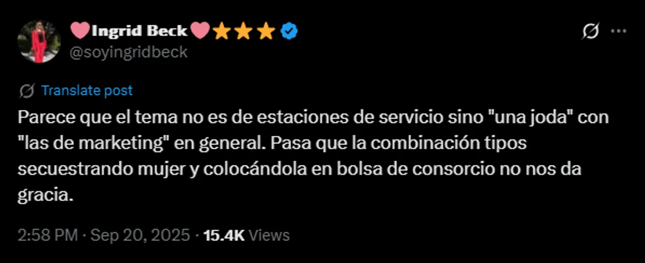 Por otra parte, la periodista Ingrid Beck también se sumó a las críticas desde su cuenta en X , con una mirada irónica y contundente. “No entiendo si secuestro de mujeres en bolsa de consorcio es tendencia en estaciones de servicio o qué. Se ve que por esos pueblos no pasamos.”