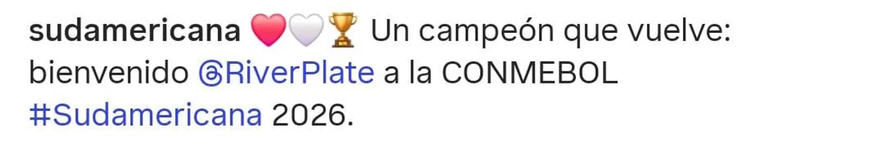 En ese contexto, la cuenta oficial de la Copa Sudamericana realizó una publicación para presentar el regreso del club de Núñez a la competencia. “Un campeón que vuelve: bienvenido River a la Conmebol Sudamericana 2026”, expresó el organismo en la descripción del posteo, acompañado por una imagen institucional que destacó el historial del equipo argentino en competencias continentales.