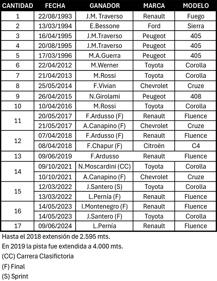 La última visita al circuito de 4.000 metros fue el 9 de junio de 2024, Leonel Pernía con el Renault Fluence se quedó con la pole position y con la victoria en la final. El podio lo completaron Franco Vivian con el Chevrolet Cruze y Matías Capurro con el Renault Fluence.