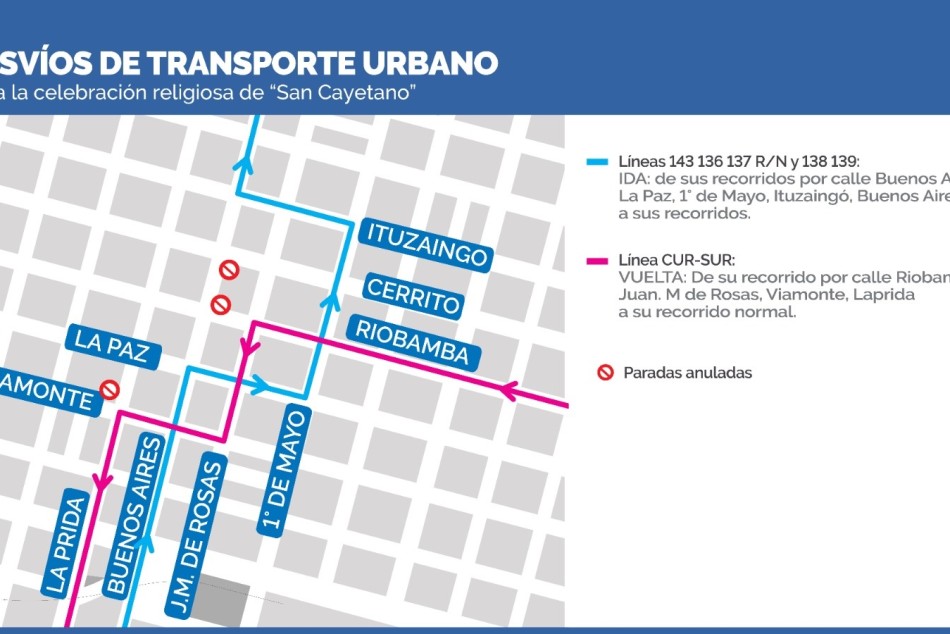 Con  motivo de la celebración de San Cayetano se realizarán desvíos de transporte urbano de pasajeros durante toda la jornada para responder a la masiva convocatoria de personas en la zona de la parroquia, específicamente en la calle Buenos aires al 2100. El corte se iniciará a las 6hs hasta las 23 hs del jueves por lo que las líneas TUP deberán realizar los siguientes desvíos: