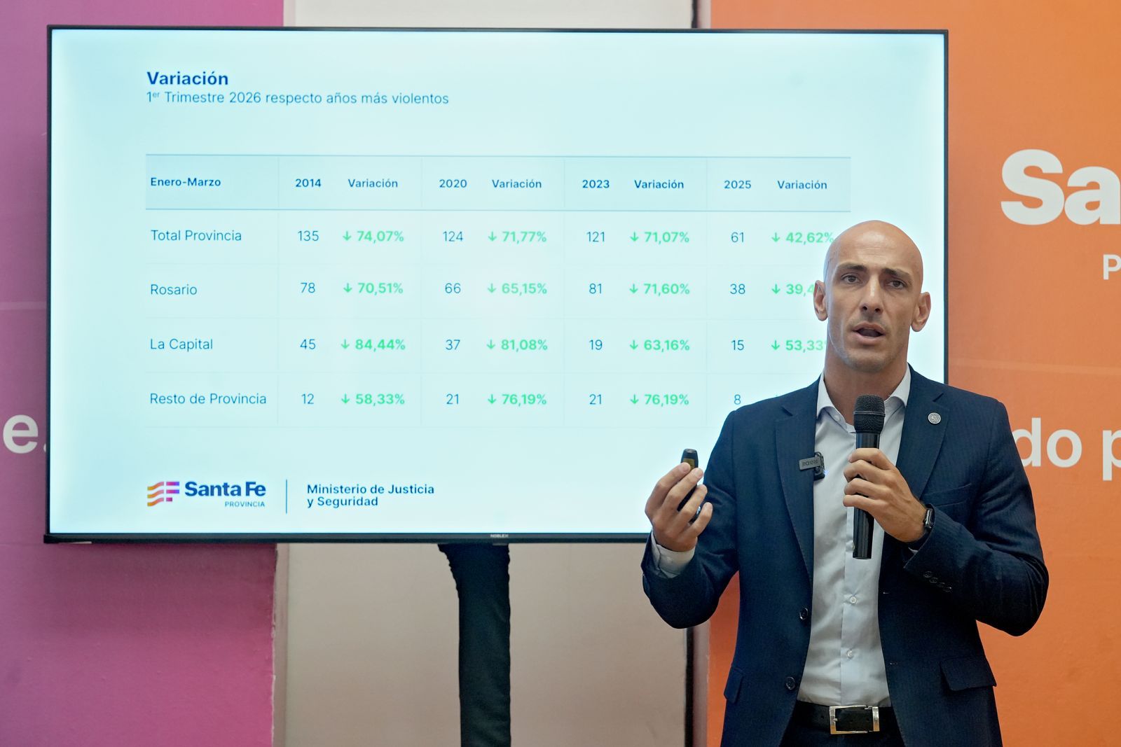 Desde la Sala Walsh de la sede de Gobierno en Rosario, el secretario de Análisis y Gestión de la Información, Esteban Santantino, afirmó que la cantidad de homicidios dolosos, en comparación con el mejor año de la actual gestión de gobierno -que fue el trimestre inicial de 2025-, cayó más del 40 % -35 este año, contra 61 del año pasado-. “Si comparamos con 2014 que teníamos el registro más alto (135 homicidios) estamos hablando de 100 homicidios menos en tres meses”, sumó el funcionario.