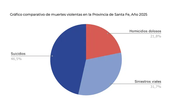 El dato surge del informe presentado por la fiscal general del Ministerio Público de la Acusación, María Cecilia Vranicich, ante la Legislatura. Según el relevamiento, los suicidios constituyen el 46,5% del total de muertes violentas (964 casos), superando ampliamente a los siniestros viales (306 casos, 31,7%) y a los homicidios dolosos (210 casos, 21,8%).