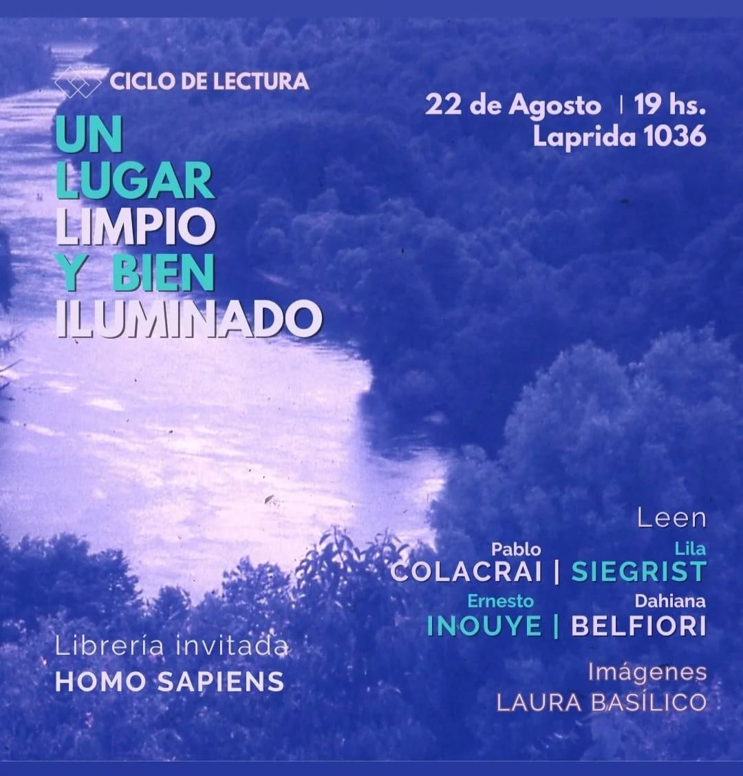 Este viernes 22 de agosto desde las 19h abrirá sus puertas una vez más el ciclo de lecturas de «Un lugar limpio y bien iluminado». Pablo Colacrai, Lila Siegrist, Ernesto Inouye y Dahiana Belfiori leerán obras de narrativa y la fotógrafa Laura Basílico proyectará imágenes analógicas. Todos ellos son destacados artistas de nuestra ciudad. La librería invitada es Homo Sapiens. La entrada es libre y gratuita.