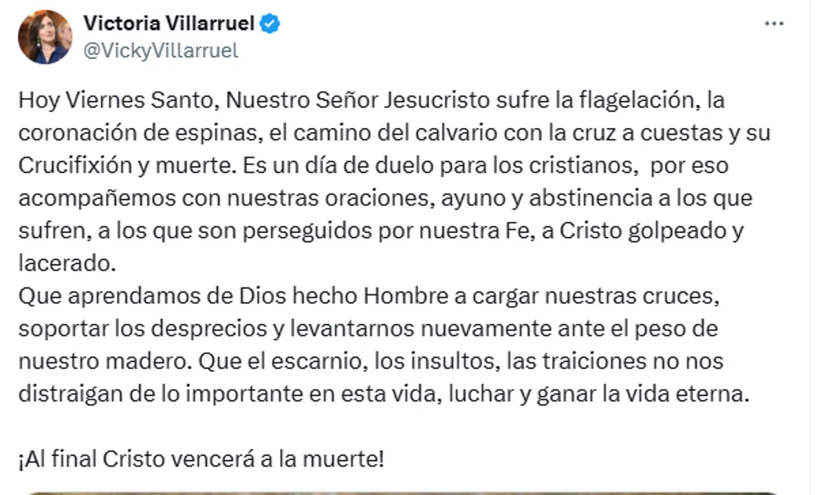 El posteo completo recordó la pasión de Cristo, pidió por los perseguidos por su fe y concluyó con una frase enfática: “Que el escarnio, los insultos, las traiciones no nos distraigan de lo importante en esta vida, luchar y ganar la vida eterna. ¡Al final Cristo vencerá a la muerte!”.