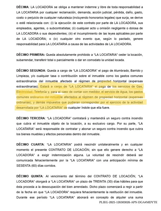 Hay dos puntos clave. Primero, el pliego establece que “la oferta no deberá incluir” el pago de expensas ordinarias (es decir, el precio ofertado es “neto” de expensas). Segundo, el contrato prevé que las expensas ordinarias, electricidad, gas y otros consumos estarán a cargo de la locataria (el Estado) y que las extraordinarias corresponden a la locadora.