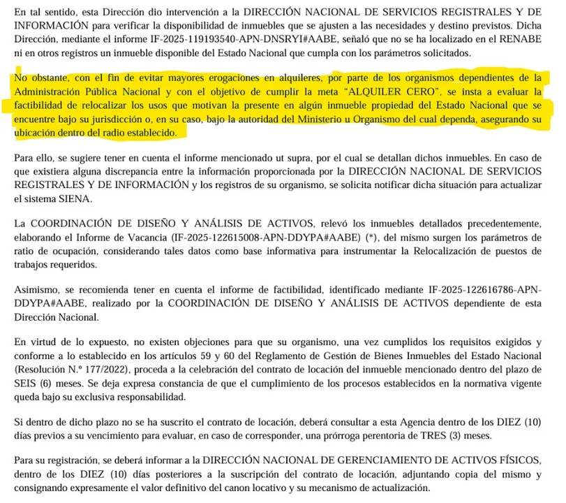 La decisión, además, se inserta en una discusión interna del propio Gobierno: el expediente menciona una nota de la Agencia de Administración de Bienes del Estado (AABE) sobre la necesidad de cumplir con el programa “ALQUILER CERO”, que busca evitar nuevas erogaciones locativas y priorizar relocalizaciones en inmuebles estatales.