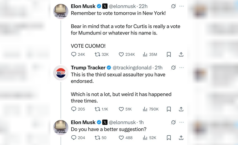 Musk publicó un mensaje pidiendo el voto por el candidato independiente Andrew Cuomo: «¡Recuerden votar mañana en Nueva York! ¡VOTEN POR CUOMO!». En el mismo posteo, el dueño de X advirtió: «Tengan en cuenta que un voto por Curtis (Sliwa) es realmente un voto por Mumdumi o como sea que se llame».