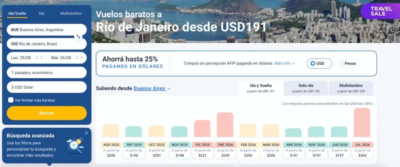 El Travel Sale 2025 dura del lunes 25 hasta el domingo 31 de agosto: ofrece rebajas de hasta el 60% en servicios turísticos y en ese contexto aparecieron pasajes aéreos regalados a ciudades como Madrid, Nueva York y Río de Janeiro.