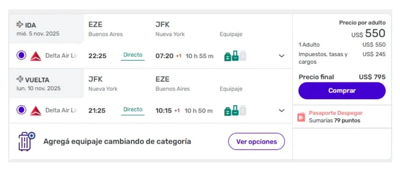 Un pasaje aéreo saliendo de Ezeiza al aeropuerto JFK el 5 de noviembre y cuyo regreso está fijado para el 10 de noviembre, tiene un costo final de 795 dólares por persona, contando impuestos y tasas.