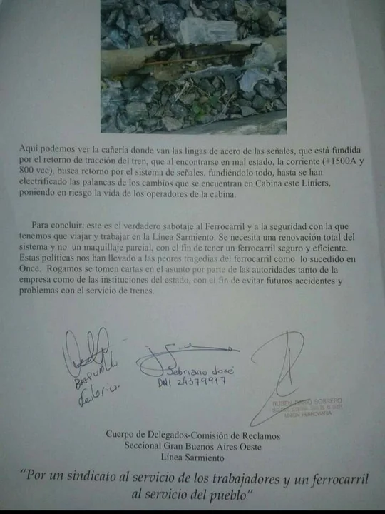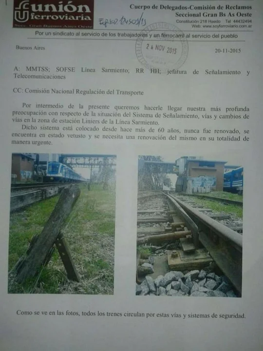 La misma problemática, también, había sido motivo de reclamo por parte de Unión Ferroviaria (UF), gremio disidente de La Fraternidad, conducido por Rubén ‘Pollo’ Sobrero, quienes informaron a la Sociedad Operador Ferroviaria, a la Subgerencia de Infraestructura y al jefe de Señalamiento, el estado de las bases de los trenes y la “falta de insumos y herramientas de trabajo”.
