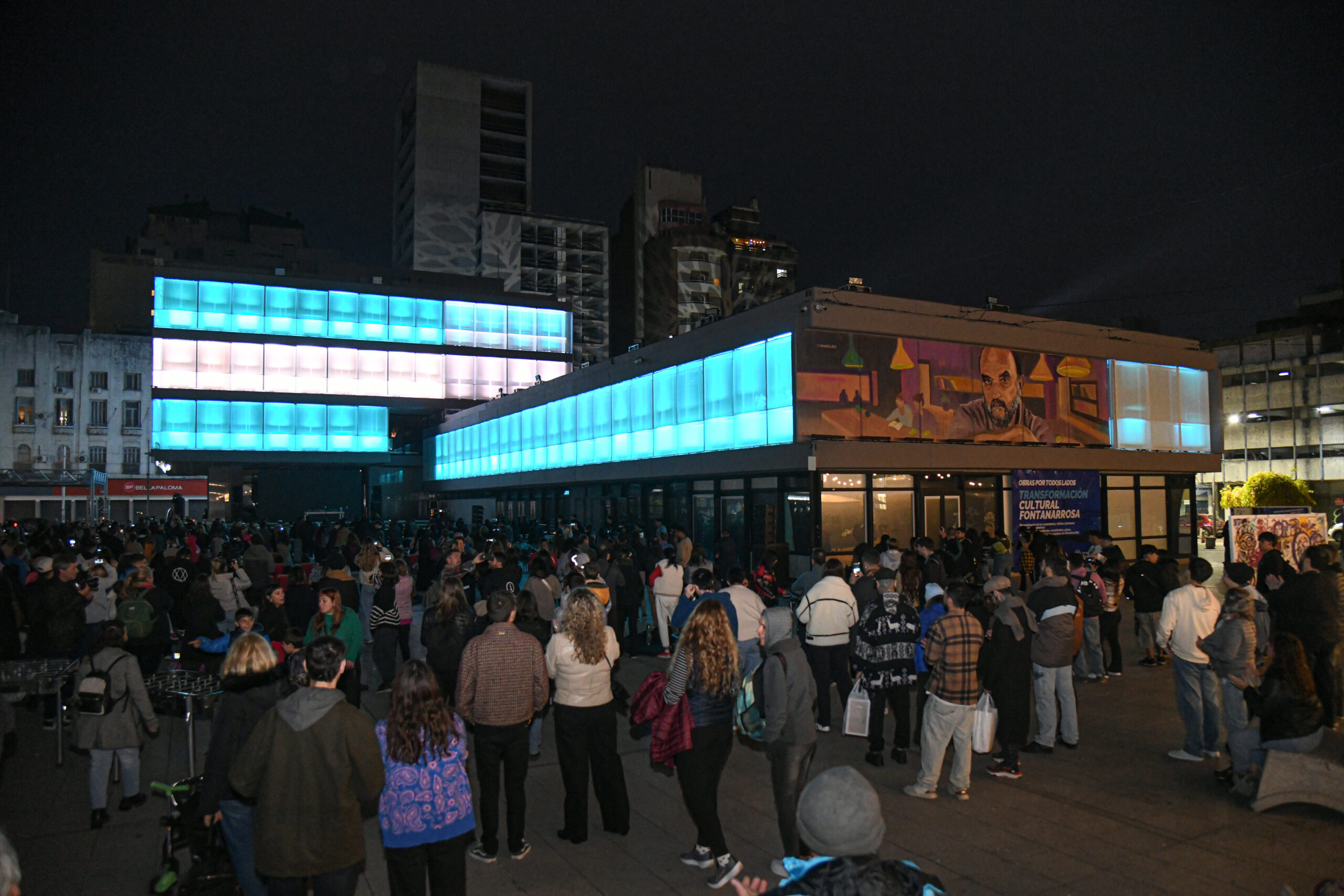 Desde las 15 hasta las 19 horas, rosarinos, rosarinas y visitantes se acercaron para ser parte de este hito. La nueva fachada, completamente pintada y adornada con una iluminación ornamental perimetral en sus tres pisos, cautivó a los y las presentes, quienes pudieron apreciar las diversas escenas lumínicas que ahora realzan la arquitectura del lugar. Las ventanas, recubiertas con lona mesh translúcida, completaron la imagen de un Fontanarrosa renovado.