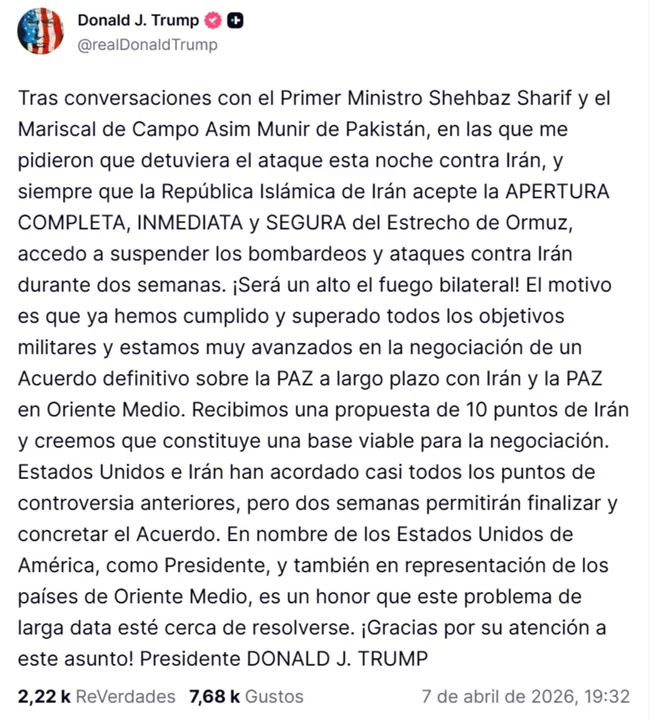 En un comunicado publicado en la red Truth Social, el mandatario estadounidense expresó: “Tras conversaciones con el Primer Ministro Shehbaz Sharif y el Mariscal de Campo Asim Munir de Pakistán, en las que me pidieron que detuviera el ataque esta noche contra Irán, y siempre que la República Islámica de Irán acepte la APERTURA COMPLETA, INMEDIATA y SEGURA del Estrecho de Ormuz, accedo a suspender los bombardeos y ataques contra Irán durante dos semanas. ¡Será un alto el fuego bilateral!”.