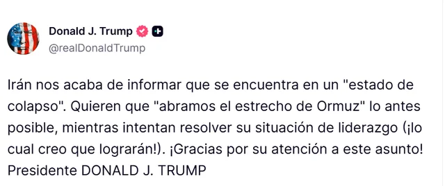 «Irán nos acaba de informar que se encuentran en un ‘estado de colapso’. Quieren que ‘abramos el estrecho de Ormuz’ lo antes posible, mientras intentan resolver su situación de liderazgo (¡lo cual creo que lograrán hacer!)», escribió Trump en su red Truth Social.