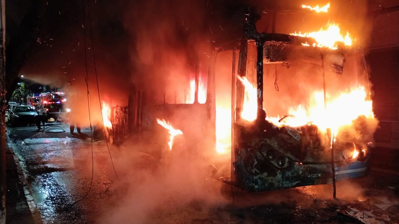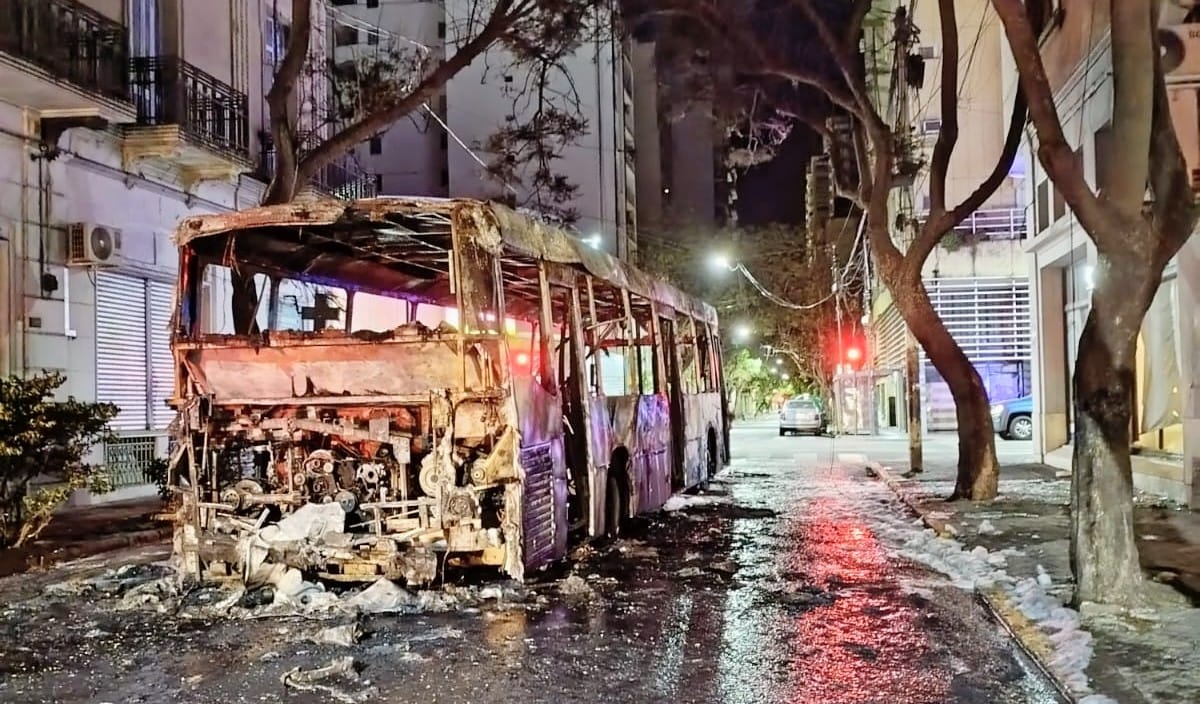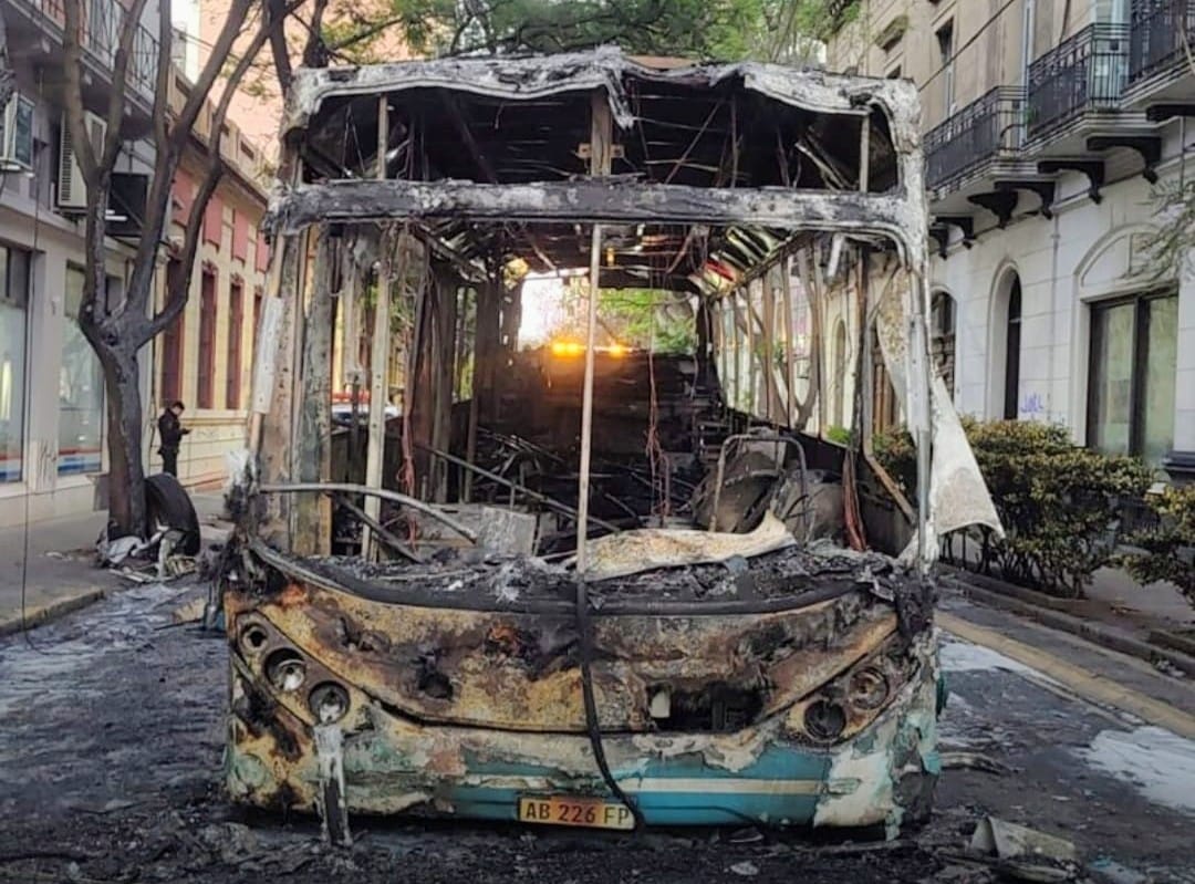 Este lunes por la madrugada se prendió fuego un colectivo en Salta y Corrientes, cuando se desplazaba por calle Corrientes. Al momento del hecho, sólo estaban abordo la conductora y un pasajero. Nadie resultó herido pero el vehículo se destruyó por completo y dañó los ventanales de la inmobiliaria de la esquina.