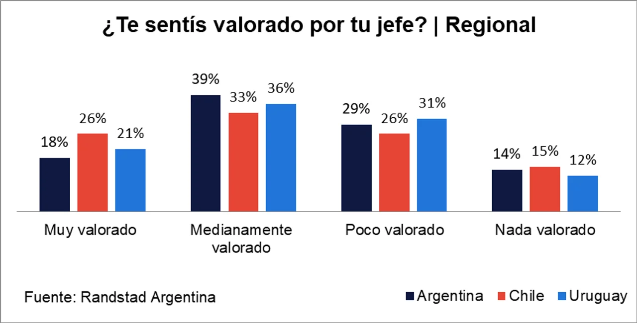 En el extremo opuesto, el 32% de los trabajadores argentinos y chilenos -y el 35% de los uruguayos- aseguran no haber recibido nunca un reconocimiento por parte de su superior.