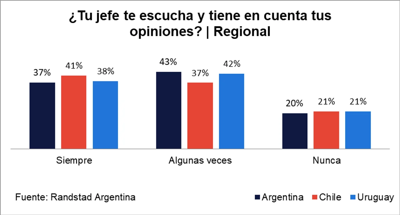 Caso contrario sucede con el 20% de los argentinos, el 21% de los uruguayos y el 21% de los chilenos, que aseguran que su jefe nunca tiene en cuenta sus opiniones.