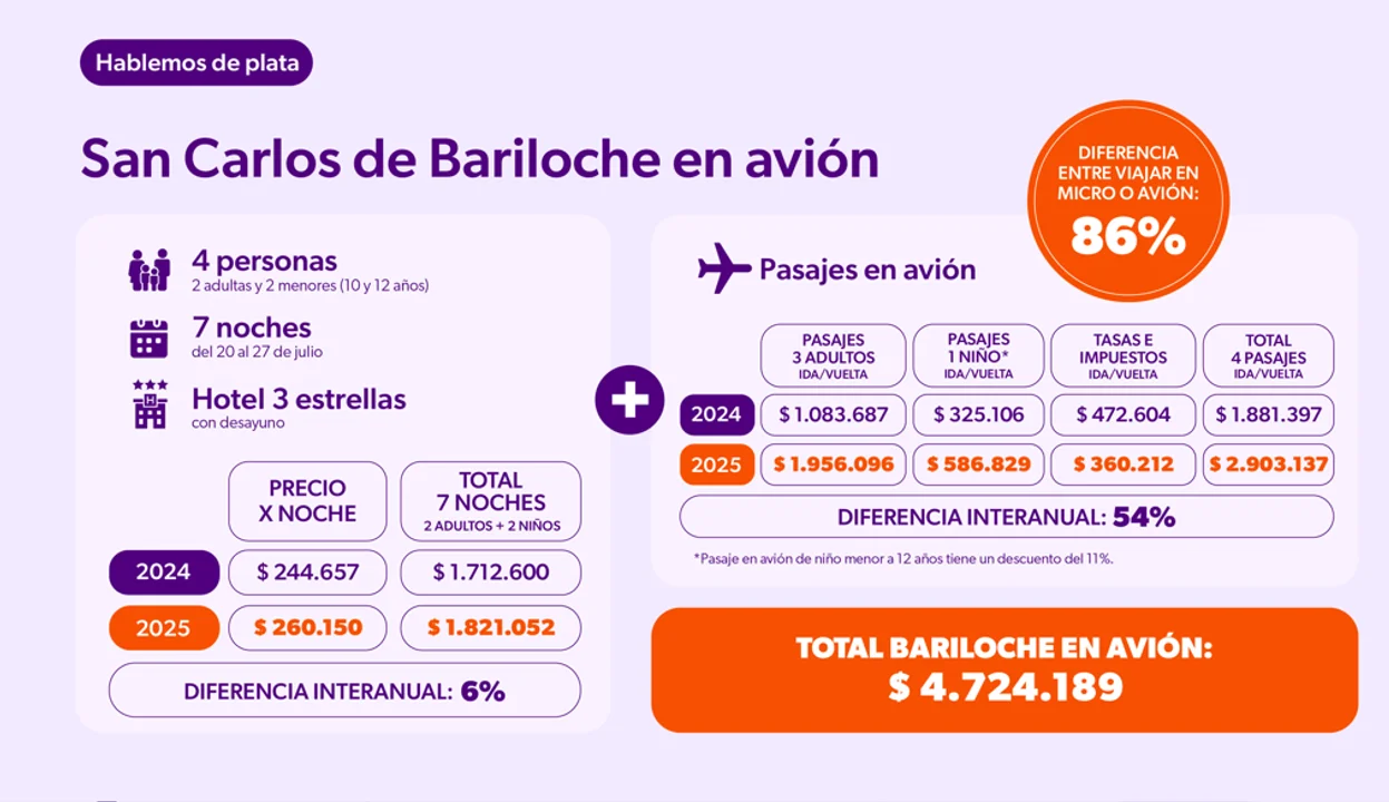 Para una familia tipo, si decide viajar a Bariloche durante 7 noches, en micro deberá contar para cubrir los gastos de micro más estadía (Hotel 3* con desayuno) con $2.541.052 (un 13% más que en 2024). En avión el total entre viaje más estadía en hotel 3 estrellas asciende a $4.724.189 (un 54% más que en 2024).